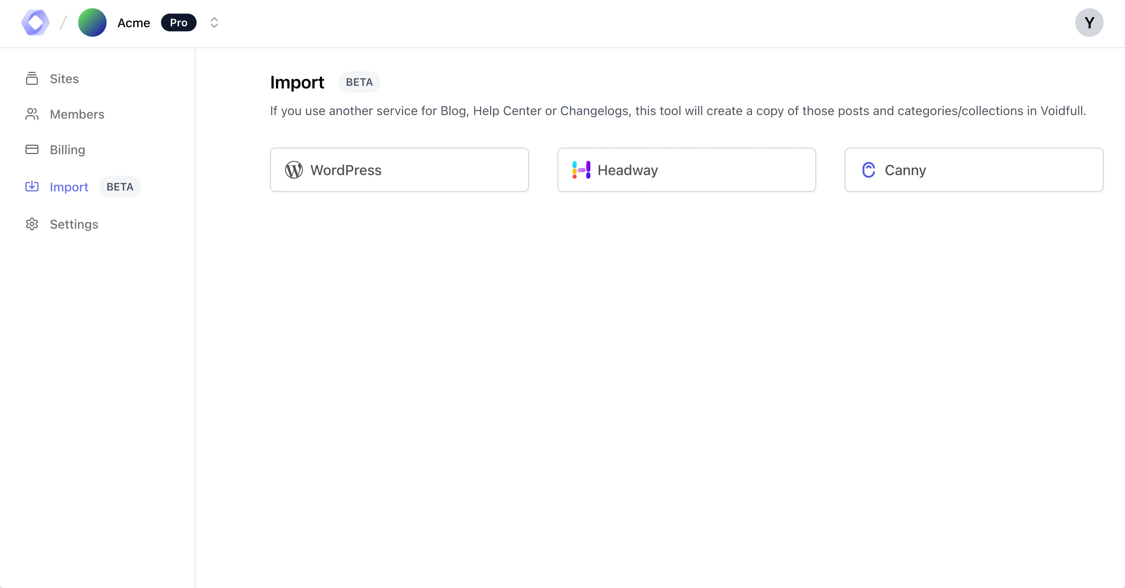 If you’re currently using another tool for your blog, help center, or changelog, Voidfull makes it easy to move your content over. With just a few clicks, our importer brings your posts and categories/collections into Voidfull.